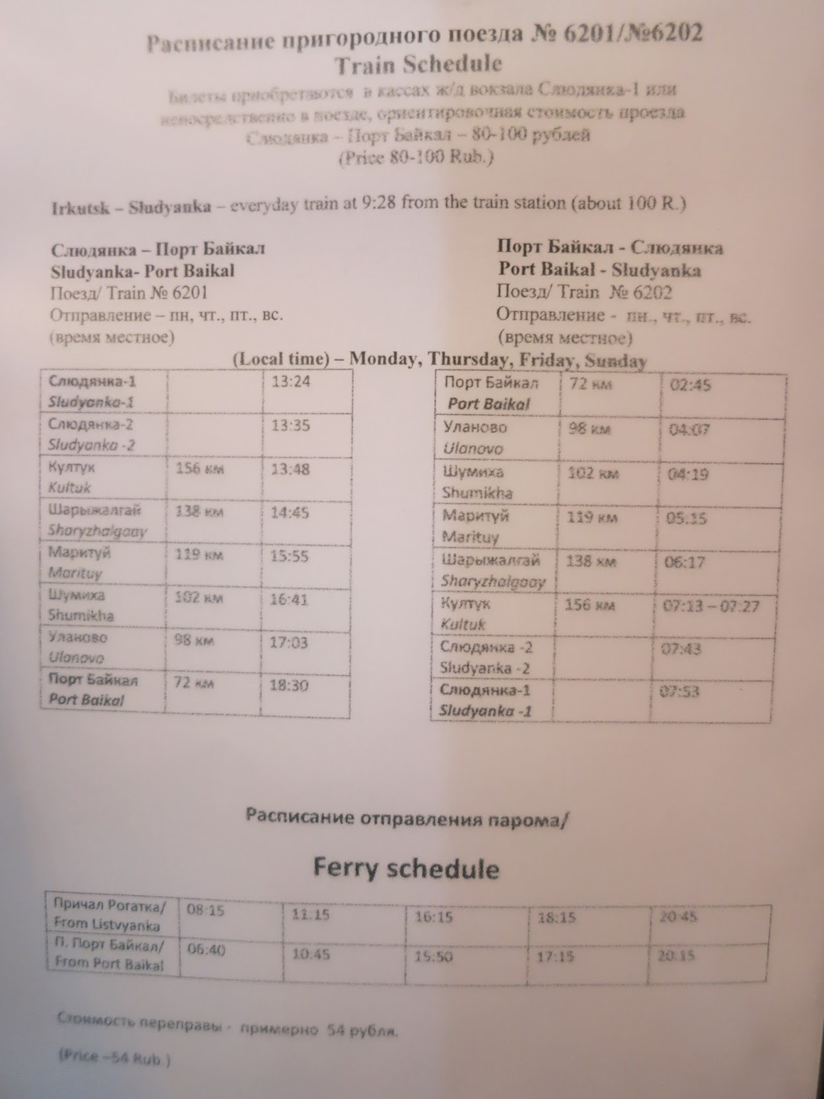現在觀光客購票,一等車廂是4500RUB,二等車廂是4000RUB;當地人購買的話,伊等車廂是3500RUB,二等車廂是3000RUB。
